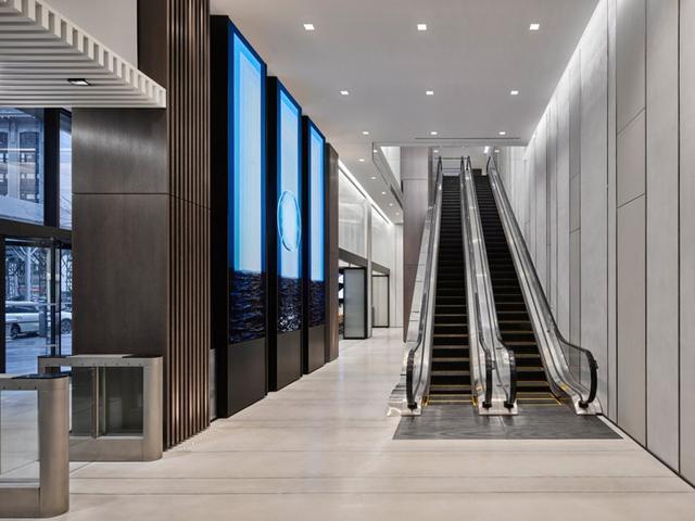 設計團隊通過建筑語言去創建一個時尚而獨特的工作空間。從入口開始,就以垂直縱向的語言去塑造空間。豎向的背景墻設計、周邊豎向拼貼的混凝土墻板,這種豎向的線性節奏將人們引至通往二樓的自動扶梯。